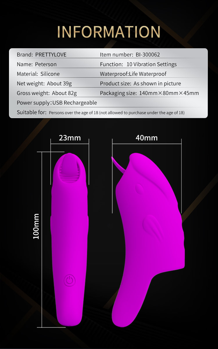 Dedeira com 10 modos de Vibração - Peterson - Honey Finger.Experimente o dobro de prazer com metade do esforço usando nosso revolucionário Vibrador de Dedo. Sua curvatura se ajusta perfeitamente ao seu corpo, enquanto a ponta em formato de língua proporciona sensações únicas – atingindo zonas sensíveis com movimentos provocantes. Feito de silicone macio e aveludado, oferece uma estimulação luxuosa e segura para o corpo.A cápsula vibratória embutida na Dedeira Jordin oferece 10 modos de vibração, potente o suficiente para levar seus momentos íntimos a outro nível.Peso:39 g.Medidas aproximadas:2,3x4x10 cm.Material:Silicone+ABS.Produto recarregável,acompanha caba USB.