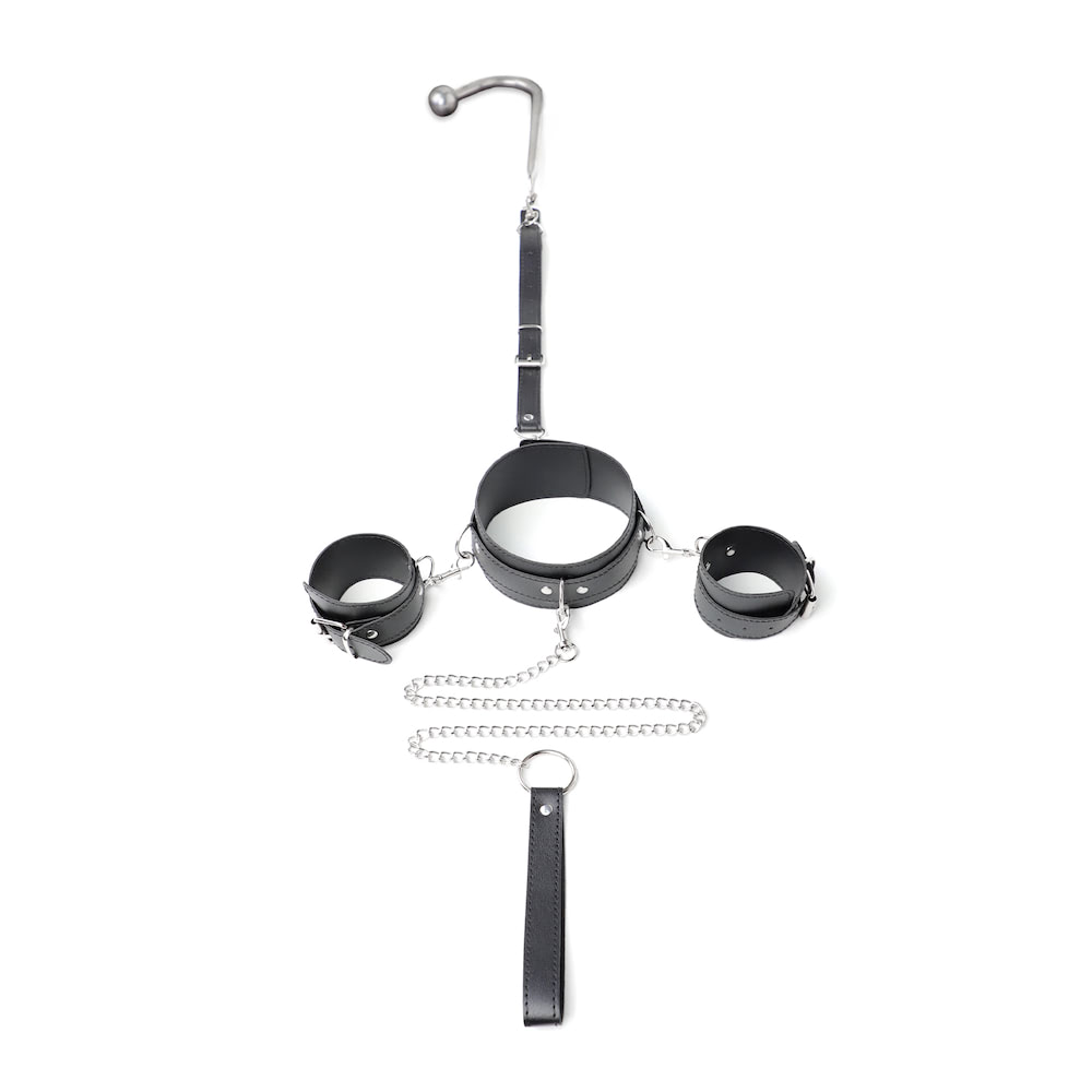 Kit de Bondage - Anal com Gancho, Algemas, Colarinho, Punhos e Corrente de Tração.Kit de Amarração Anal com Gancho: 1 coleira, 2 algemas ajustáveis, 1 faixa de couro, 1 gancho anal e 1 corrente de tração. Todos os acessórios do kit de amarração podem ser usados sozinhos ou em diversas combinações interessantes.Tanto as algemas quanto as cintas de amarração são ajustáveis para se adaptarem ao seu tamanho. A bola anal proporcionará estimulação anal e orgasmos múltiplos para o seu parceiro. É adequada para homens e mulheres.Medidas aproximadas: Gancho anal: 3x23cm; algemas: 32cm; coleira: 50cm; tração: 65cm; cinto: 50cm.Peso:400 g.Material:PVC+Metal.