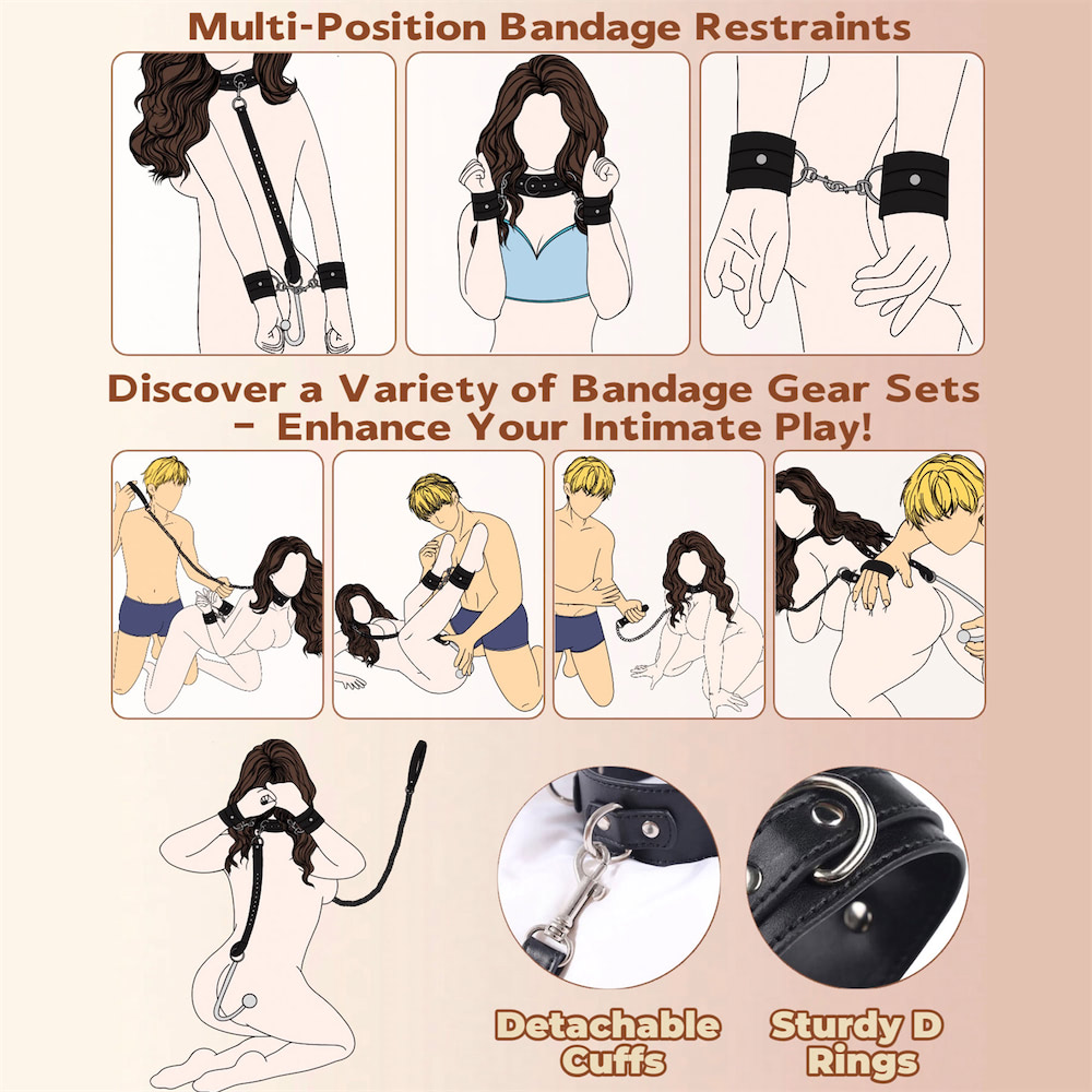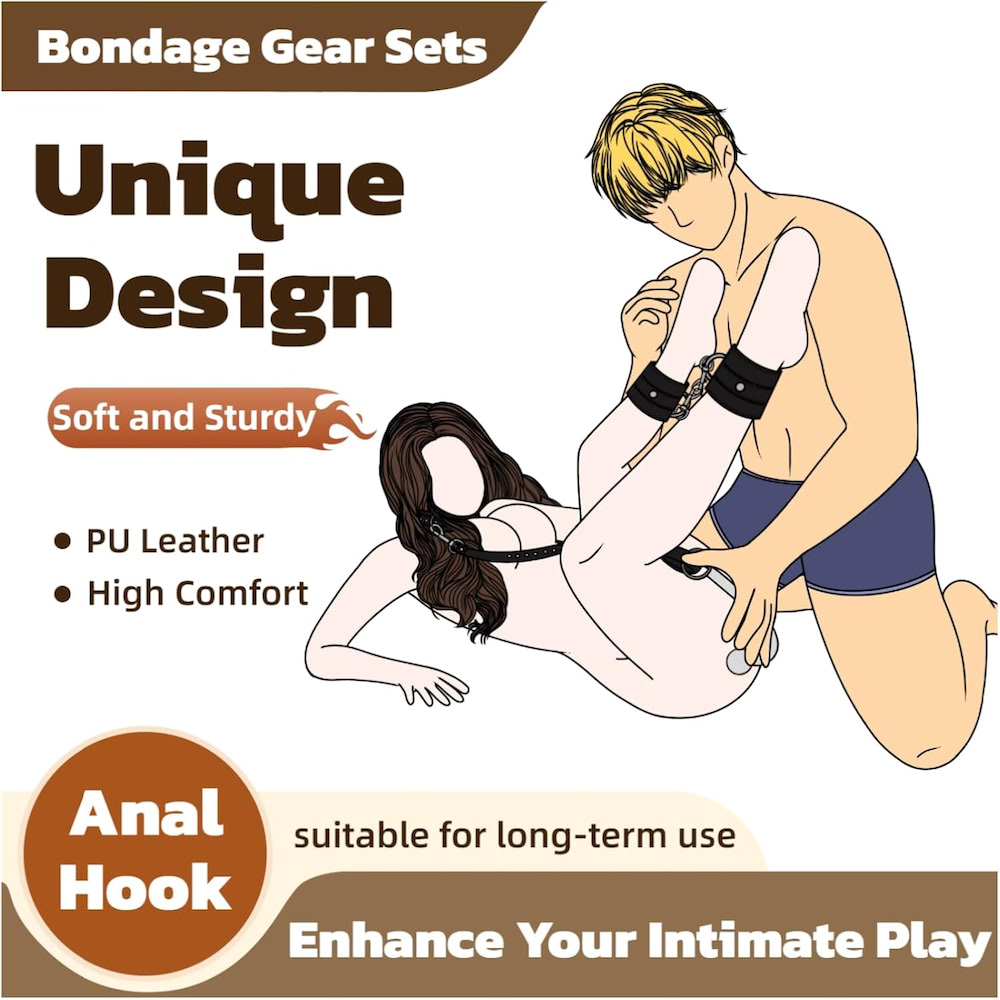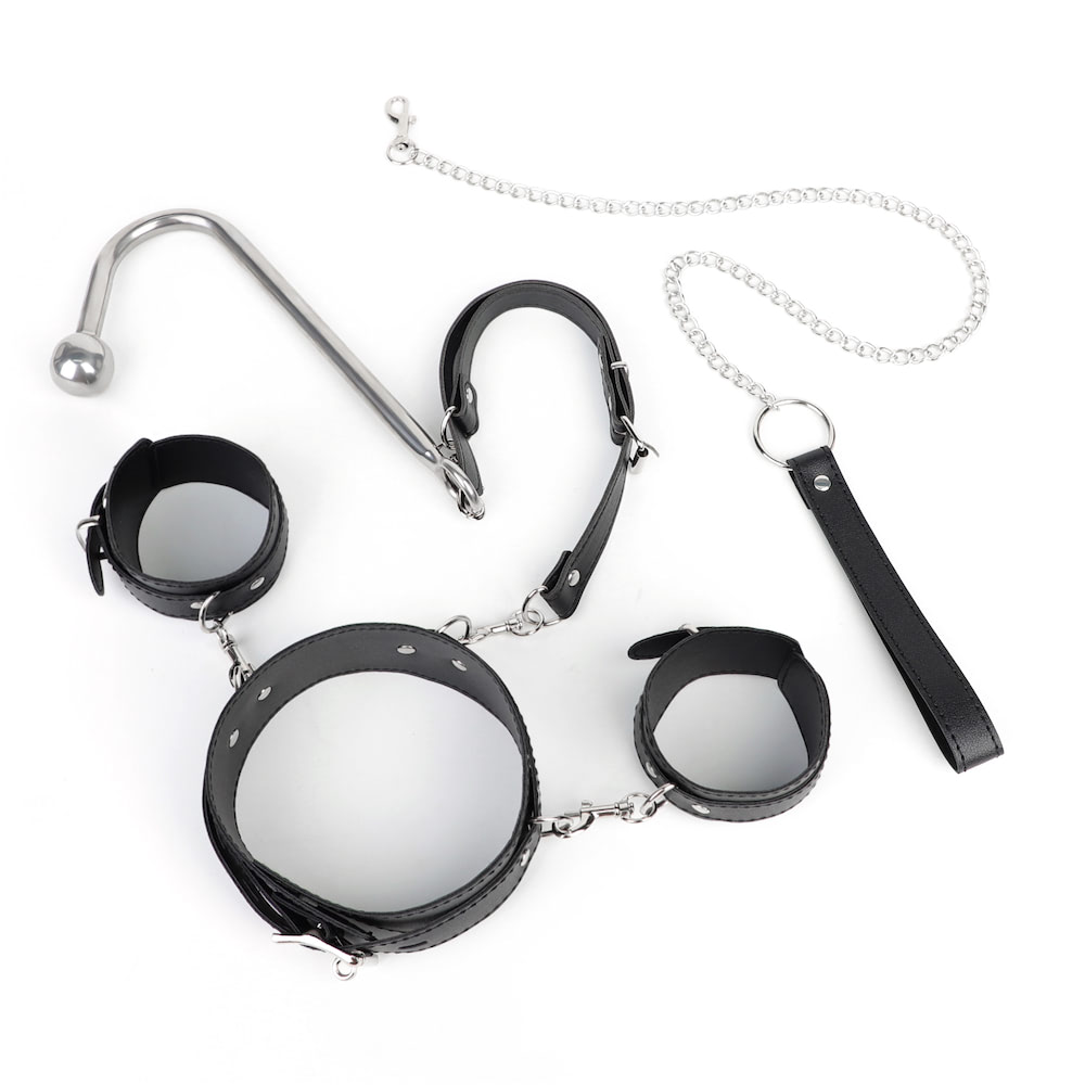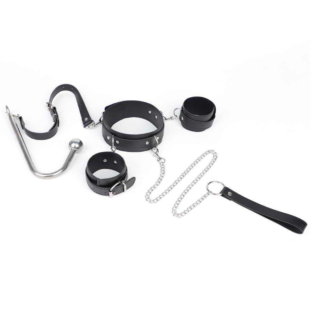 Kit de Bondage - Anal com Gancho, Algemas, Colarinho, Punhos e Corrente de Tração.Kit de Amarração Anal com Gancho: 1 coleira, 2 algemas ajustáveis, 1 faixa de couro, 1 gancho anal e 1 corrente de tração. Todos os acessórios do kit de amarração podem ser usados sozinhos ou em diversas combinações interessantes.Tanto as algemas quanto as cintas de amarração são ajustáveis para se adaptarem ao seu tamanho. A bola anal proporcionará estimulação anal e orgasmos múltiplos para o seu parceiro. É adequada para homens e mulheres.Medidas aproximadas: Gancho anal: 3x23cm; algemas: 32cm; coleira: 50cm; tração: 65cm; cinto: 50cm.Peso:400 g.Material:PVC+Metal.