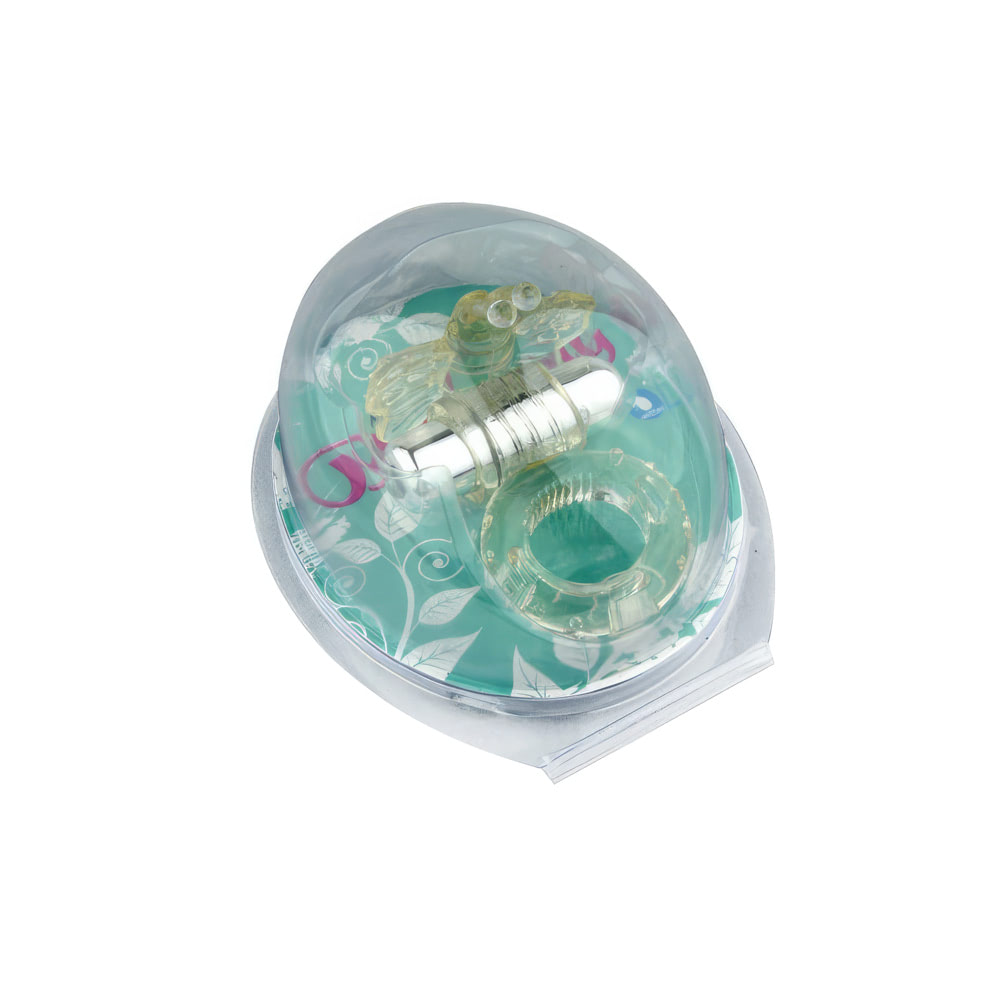 Anel peniano com 10 vibrações estimulador borboleta.Produto: 7,5x5,5x5cm Diâmetro anel: 3 cm Embalagem: 15x9x11 cm Utiliza: 3 baterias LR44 inclusas.