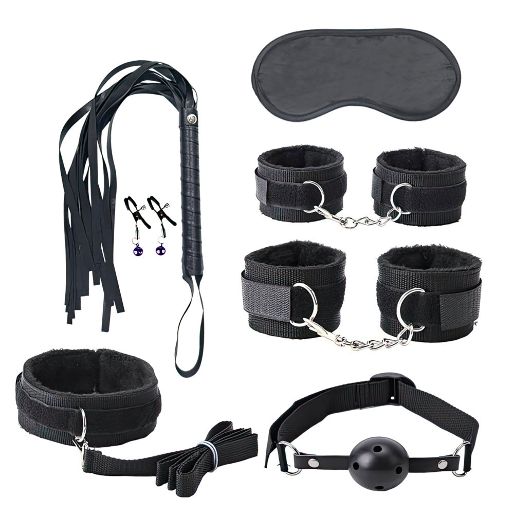 DescriçãoKit Sado Bondage com 7 Produtos.Este kit sado é composto por mordaça, venda, coleira com estirante, guia, chicote, algema, tornozeleira e corda em algodão. Projetado para explorar o fetiche, a dor e o prazer do bondage e do sadomasoquismo, este kit oferece uma experiência completa e versátil. Cada peça é confeccionada em materiais de alta qualidade, como courvin e PVC, garantindo segurança e durabilidade. Ideal para casais que desejam experimentar novas formas de conexão e brincadeiras eróticas, este kit combina estilo, funcionalidade e praticidade em um conjunto marcante e versátil.Peso: 240 g.Medidas aproximadas:Coleira: 44 cm de comprimento, 5,6 cm de largura.Guia: 61 cm de comprimento, 2 cm de largura.Venda: 19,0 cm de comprimento, 7,5 cm de largura.Mordaça: 53,5 cm de comprimento, 2,7 cm de espessura.Algema: 29 cm de comprimento, 5,2 cm de largura.Tornozeleira: 33,3 cm de comprimento, 5,5 cm de largura.Chicote: 40 cm de comprimento total, cabo 24 cm de comprimento.Corda: 5,40 metros de comprimento total.Material: Courvin e PVC.