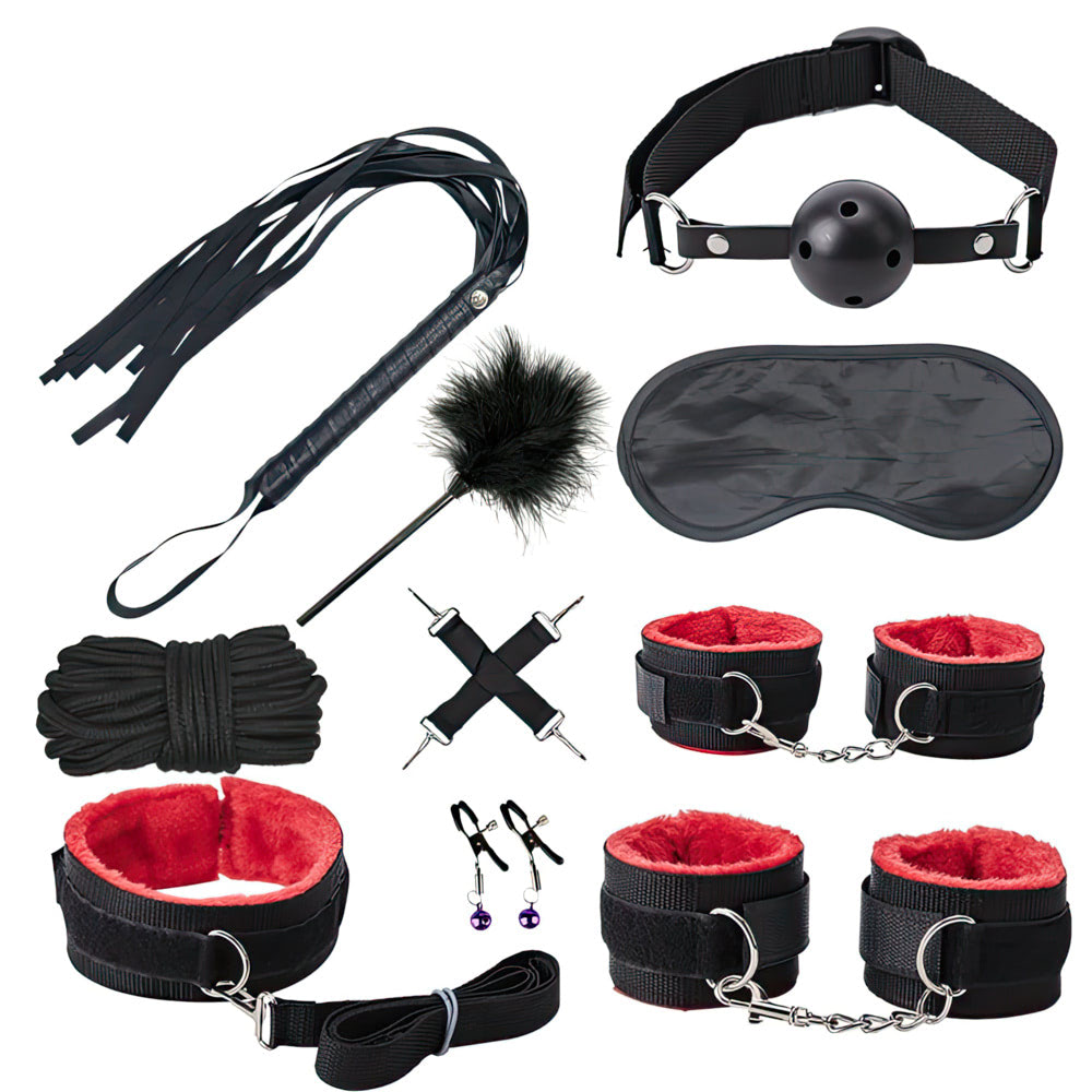 Kit Sado Bondage com 10 Produtos.Este kit sado é composto por mordaça, venda, coleira com estirante, guia, chicote, algema, tornozeleira e corda em algodão. Projetado para explorar o fetiche, a dor e o prazer do bondage e do sadomasoquismo, este kit oferece uma experiência completa e versátil. Cada peça é confeccionada em materiais de alta qualidade, como ferro e poliéster não tóxico, garantindo segurança e durabilidade. Ideal para casais que desejam experimentar novas formas de conexão e brincadeiras eróticas, este kit combina estilo, funcionalidade e praticidade em um conjunto marcante e versátil.Peso: 350 g.Medidas aproximadas:Coleira 44 cm de comprimento, 5,6 cm de largura. Guia 61 cm de comprimento, 2 cm de largura. Venda 19,0 cm de comprimento, 7,5 cm de largura.Mordaça 53,5 cm de comprimento, 2,7 de espessura.Algema 29 cm de comprimento, 5,2 cm de largura.Tornozeleira 33,3 cm de comprimento, 5,5 cm de largura.Chicote 40 cm de comprimento total, cabo 24 cm de comprimento.Corda 5,40 metros de comprimento total.Material: Ferro e Poliéster não tóxico.