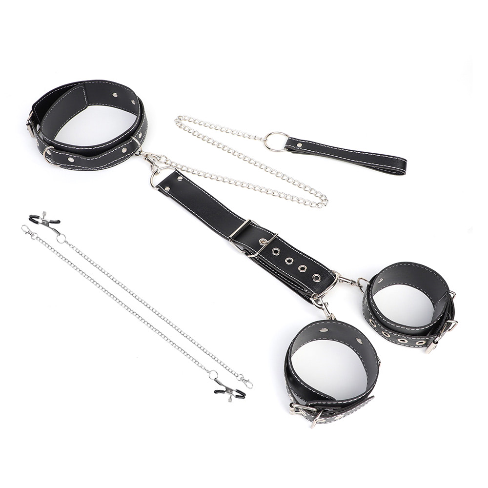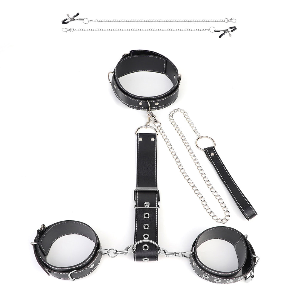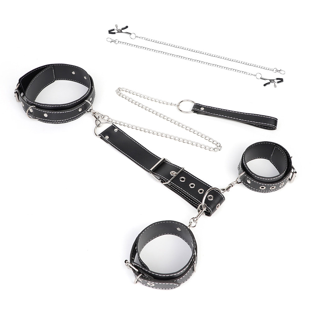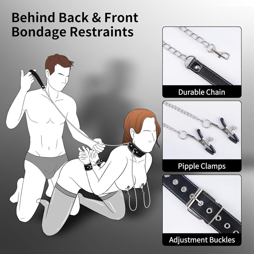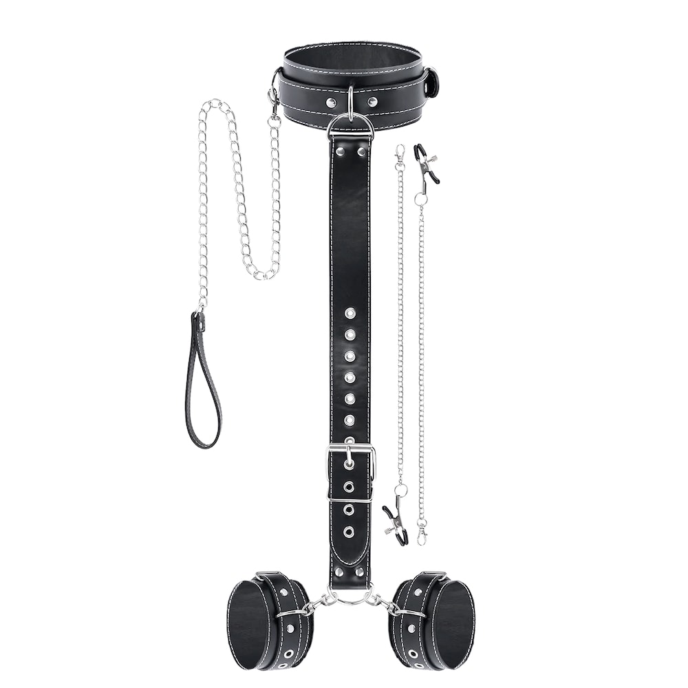 Kit Bondage com Corrente de Tração, Grampos de Mamilo, Algemas Ajustáveis, Coleira.Confeccionado em couro premium e forro macio e macio, este conjunto de bondage equilibra a estética erótica com o conforto que a pele precisa. O sistema de restrições BDSM (do pescoço aos pulsos) garante que seus jogos excêntricos permaneçam intensos, mas confortáveis.Algemas e coleira ajustáveis se adaptam à maioria dos tipos de corpo, enquanto a corrente de tração permite um controle dominante. Alterne entre as posições de bondage – desde a contenção por trás das costas até amarras na cabeceira da cama, iniciando infinitas brincadeiras sexuais a dois.Inclui coleira com argolas em D, 2 algemas forradas com pele, 2 grampos de mamilo removíveis e corrente de tração. Acessórios para combinar para roleplay BDSM – provocação sensorial com grampos, dominação suave com puxões na coleira ou intimidade com restrição total.Medidas aproximadas: Coleira: 50 cm; Algemas: 32 cm; Comprimento do cinto: 70 cm; Puxador: 80 cm; Grampos de mamilo: 40 cm.Peso:370 g.Material:PVC+Metal.
