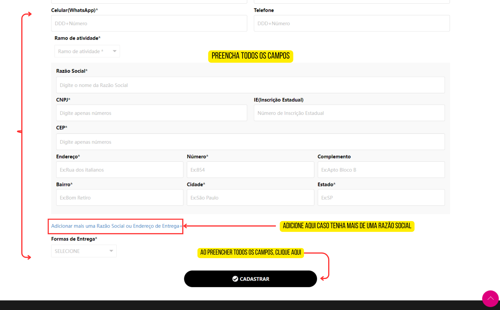 Se necessário, você pode inserir outra razão social ou endereço durante o preenchimento do formulário. Após preencher todos os campos, clique em "Cadastrar".